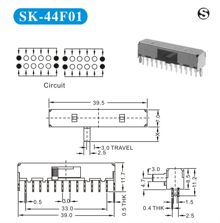 SK-44F01 詳細資料 產(chǎn)品說明: 技術(shù)指標(biāo): 使用溫度范圍 -20~+70℃ 耐壓 AC250V(50Hz)/min 額定負荷 DC 50V 0.5A 動作力 250±100gf 接觸電阻 ≤0.05Ω 機械壽命 10000次 絕緣電阻 ≥100MΩ