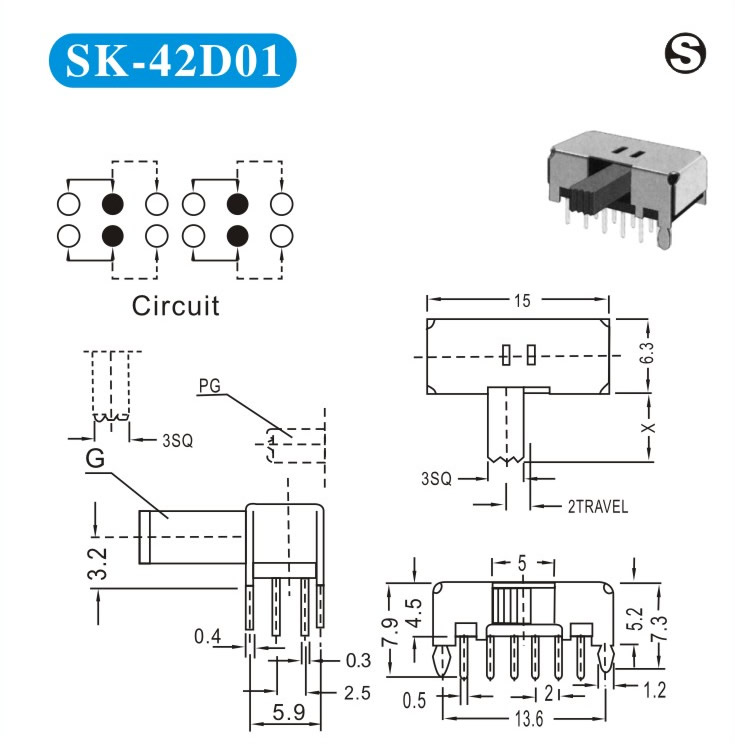 SK-42D01 詳細(xì)資料 產(chǎn)品說明: 技術(shù)指標(biāo): 使用溫度范圍 -20~+70℃ 耐壓 AC250V(50Hz)/min 額定負(fù)荷 DC 50V 0.5A 動作力 250±100gf 接觸電阻 ≤0.05Ω 機械壽命 10000次 絕緣電阻 ≥100MΩ