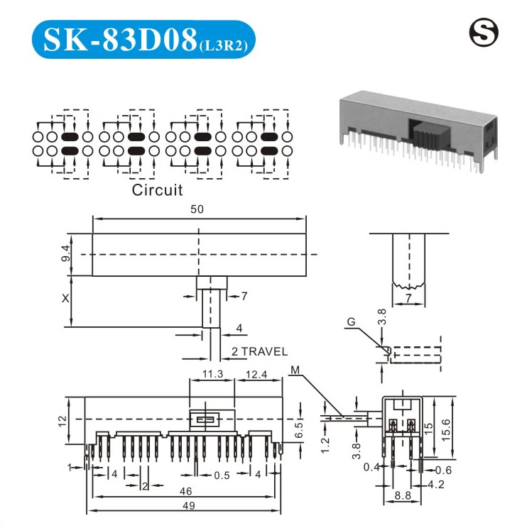 SK-83D08 詳細(xì)資料 產(chǎn)品說(shuō)明: 技術(shù)指標(biāo): 使用溫度范圍 -20~+70℃ 耐壓 AC250V(50Hz)/min 額定負(fù)荷 DC 50V 0.5A 動(dòng)作力 250±100gf 接觸電阻 ≤0.05Ω 機(jī)械壽命 10000次 絕緣電阻 ≥100MΩ