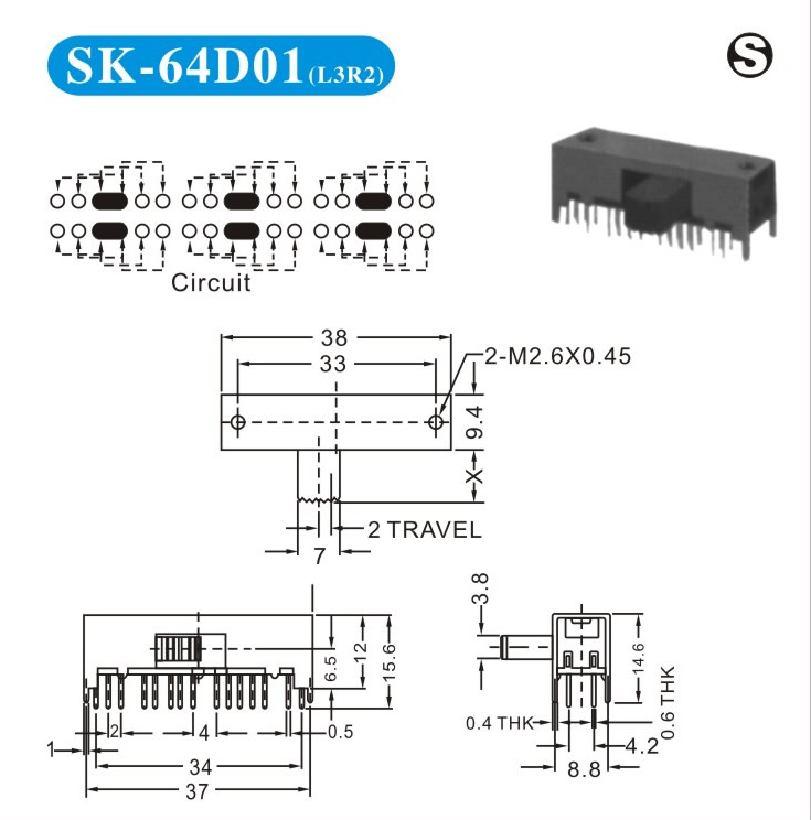 SK-64D01 詳細資料 產(chǎn)品說明: 技術指標: 使用溫度范圍 -20~+70℃ 耐壓 AC250V(50Hz)/min 額定負荷 DC 50V 0.5A 動作力 250±100gf 接觸電阻 ≤0.05Ω 機械壽命 10000次 絕緣電阻 ≥100MΩ