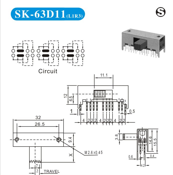 SK-63D11 詳細資料 產(chǎn)品說明: 技術指標: 使用溫度范圍 -20~+70℃ 耐壓 AC250V(50Hz)/min 額定負荷 DC 50V 0.5A 動作力 250±100gf 接觸電阻 ≤0.05Ω 機械壽命 10000次 絕緣電阻 ≥100MΩ